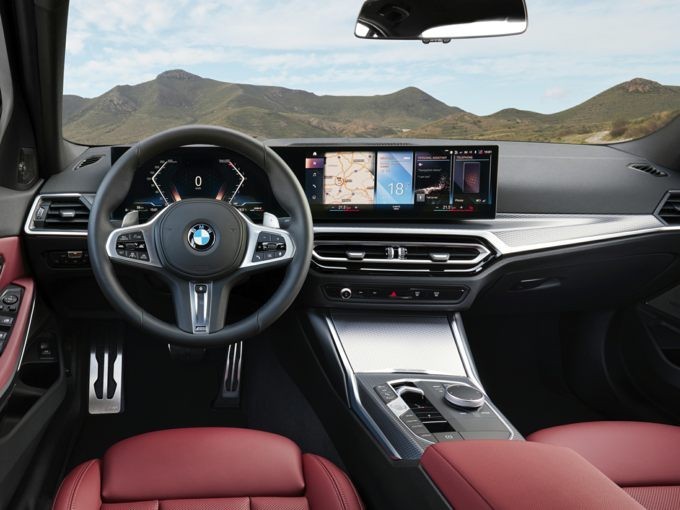 The 14.9-inch curved infotainment display is equipped with BMW's latest infotainment system and BMW navigation. It can be operated with natural voice recognition software, a touch screen, or a physical controller installed in the console, and it combines wireless Apple CarPlay and Android Auto with SiriusXM